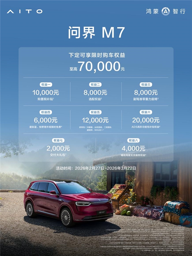 新春购车好时机!2月27日,问界公布最新专属权益:即日起至3月22日,下定问界M7可享至高70,000元限时购车权益,助力更多用户轻松解锁30万元级智慧出行体验。